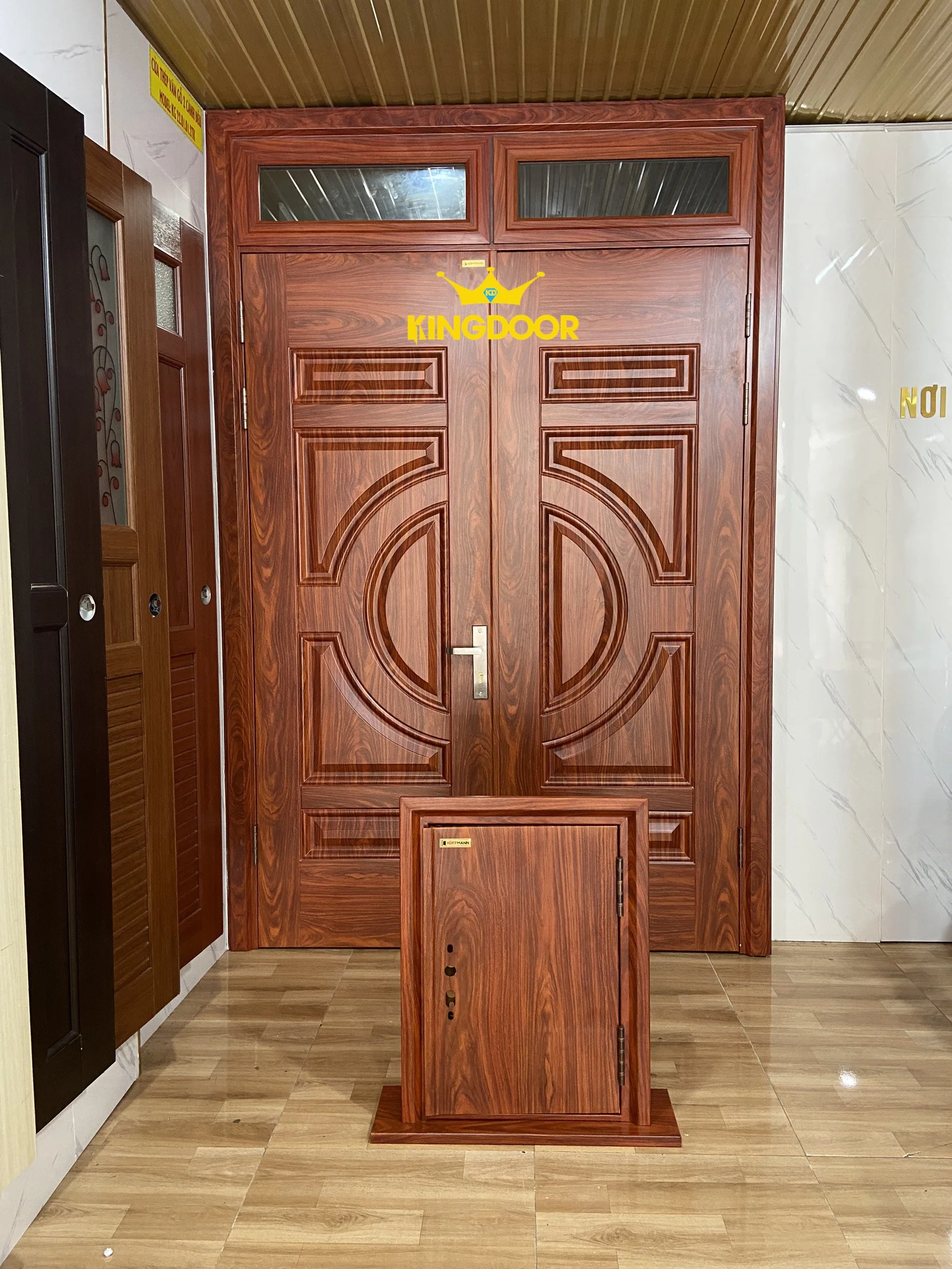 | Cửa thép vân gỗ 2 cánh lệch có ô thoáng kính (KG-21)